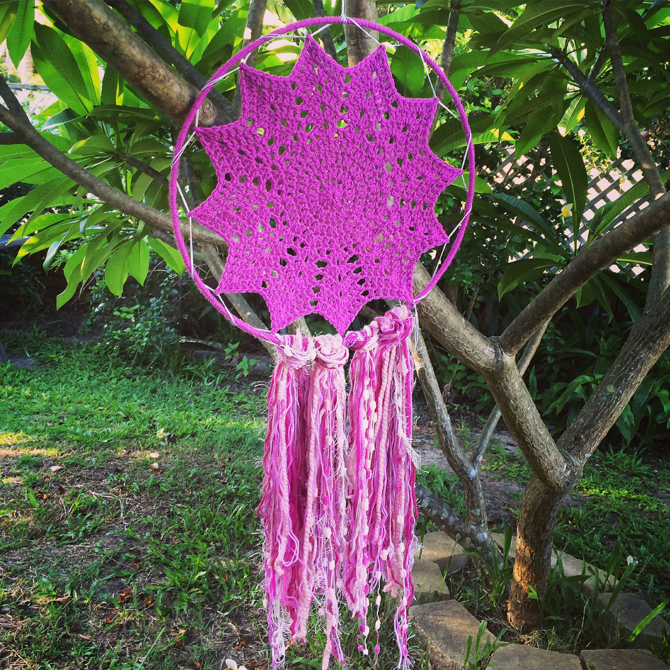 Covering the hoop took the longest, and making the star was very simple as I had made that pattern before. It took a while to figure out the best way to attach everything together.